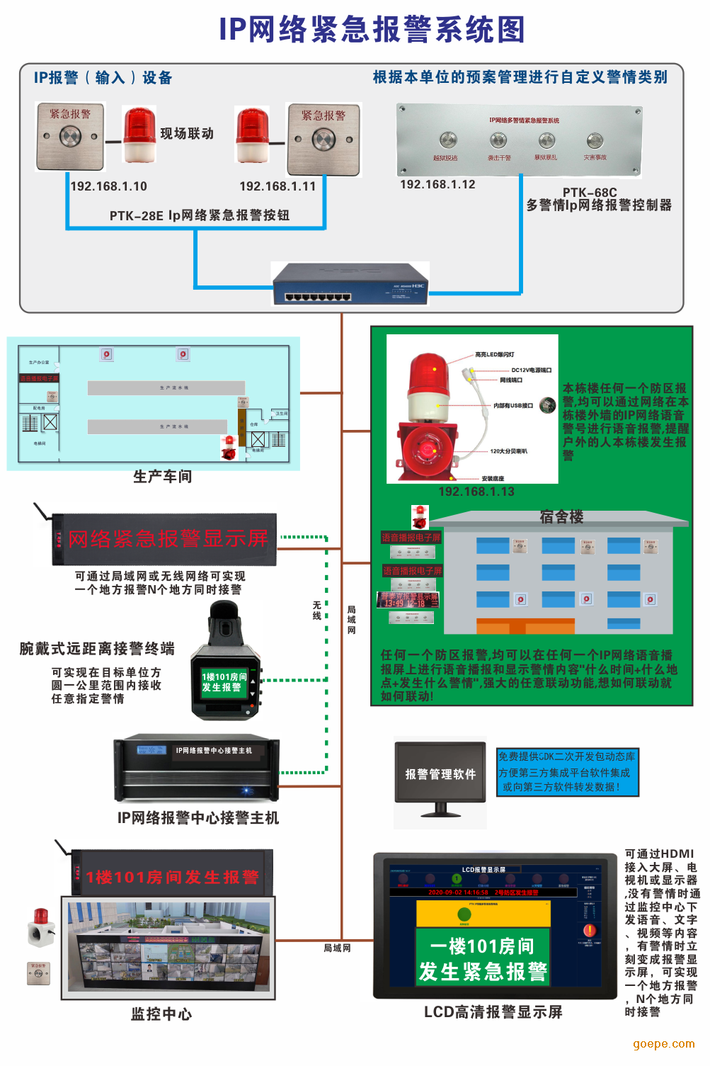 IP网络紧急报警是在监区值班室、办公室、谈话室、门卫值班室、厂区办公室及重点部位,隐蔽或公开地安装紧急报警按钮,对出现的突发警情进行报警,并通过网络连到监控中心,实现快速联动处置的功能,周界报警与紧急报警共用一个报警系统,集成到同一个报警控制软件中系统中,报警系统应提供SDK开发包或动态库,提供监所综合管理平台或第三方集成平台的标准总线封装接口,使平台及客户端可以根据权限对系统进行操作和管理。